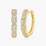 Chic Baguette Diamond Halo Huggie Hoop Earrings featuring sleek baguette diamonds encircled by a halo of sparkling stones, offering a modern yet timeless design for everyday elegance.